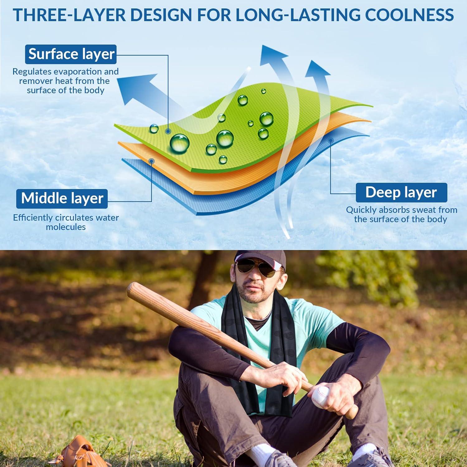 Three-Layer Design, Persistent Cooling: Sukeen outdoor sports cooling towel adopts a three-layer design, with the outer layer regulating evaporation to remove heat from the body surface, the middle layer effectively circulating water molecules and the deep layer quickly absorbing sweat from the body surface. This allows you to feel instantly cool, and the towel can stay cool for up to 3 hours when refrigerated (depending on the situation)