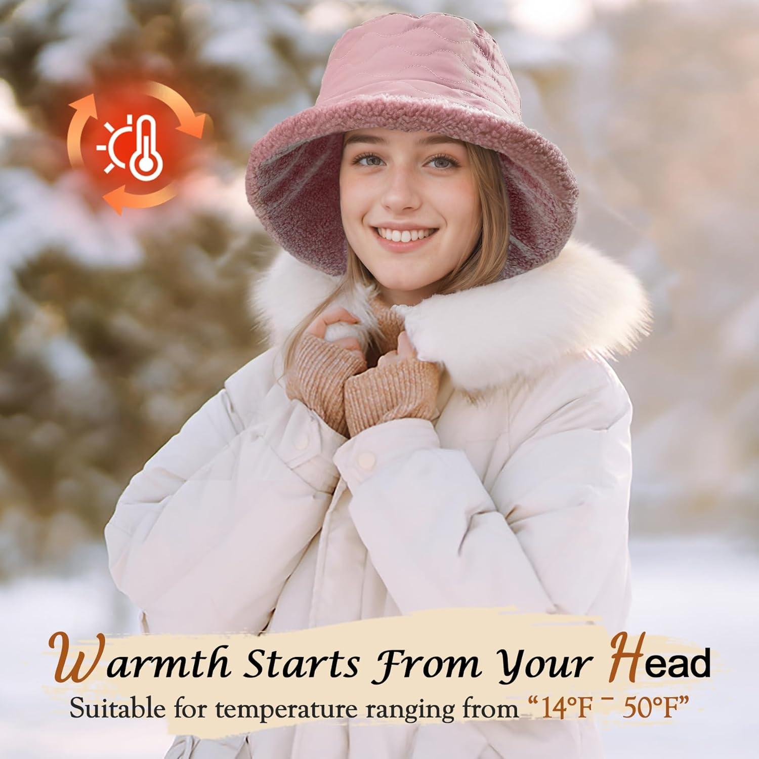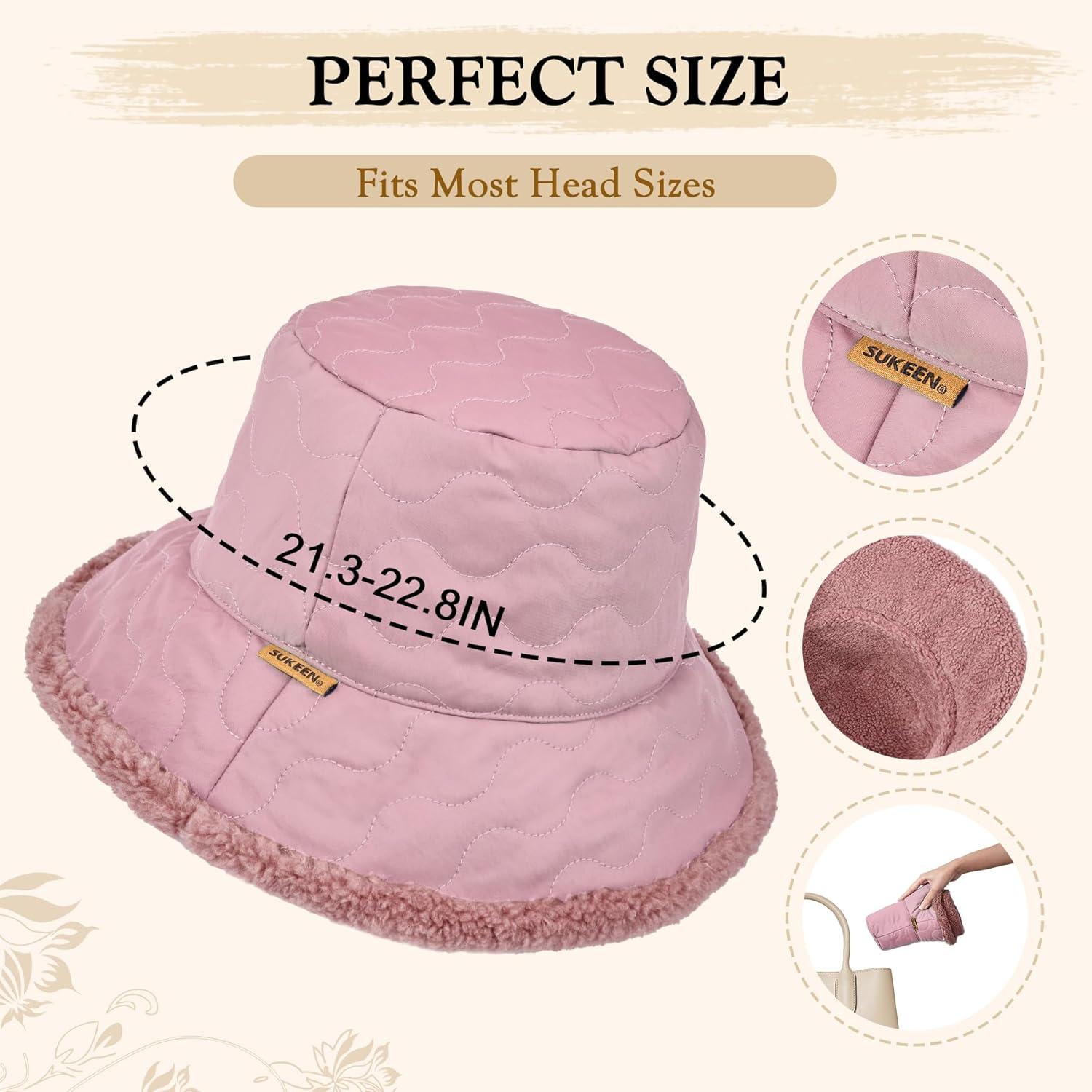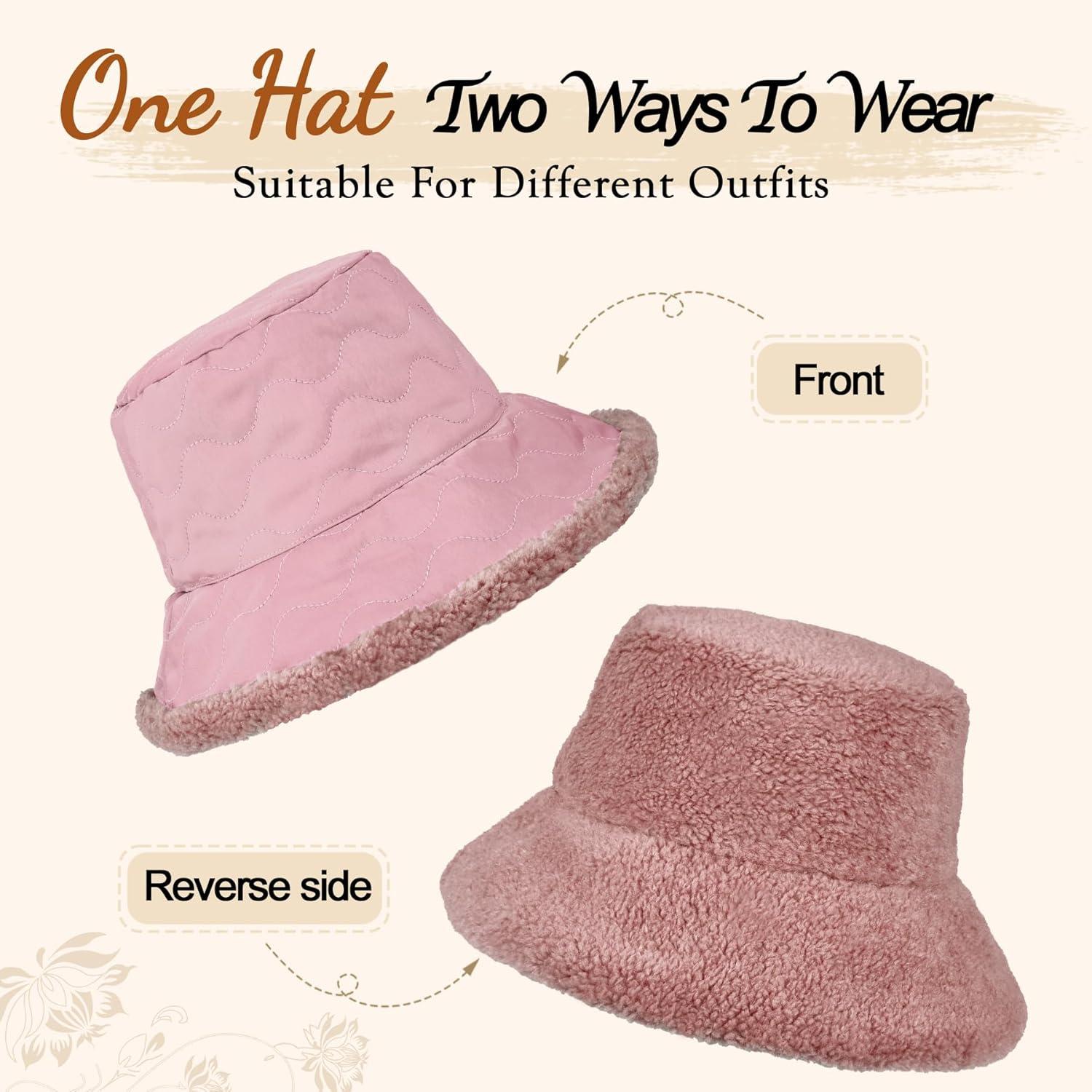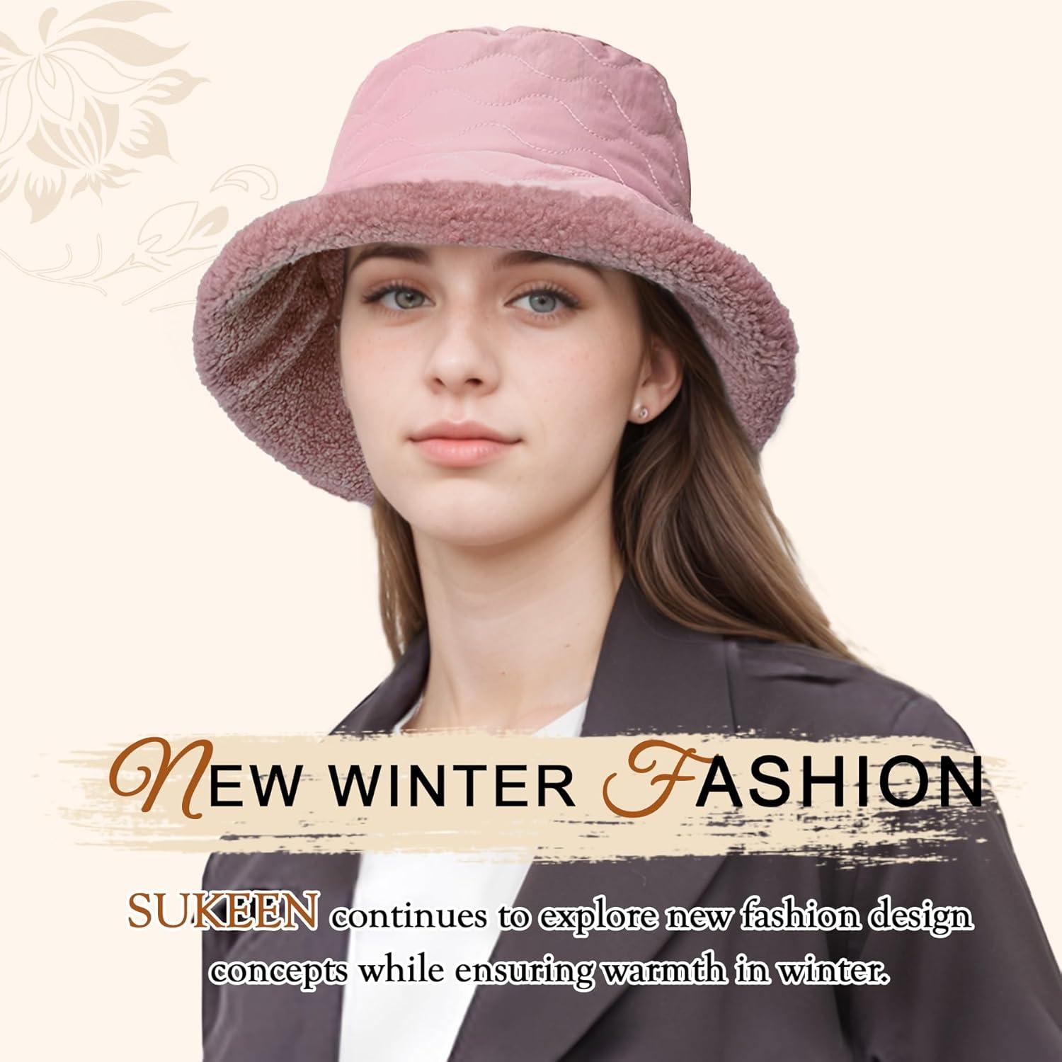 Sukeen Fuzzy Bucket Hat for Women Wide Brim Faux Fur Winter Warm Hat Fluffy Teddy Sherpa Fisherman Cap for Lady(Pink)