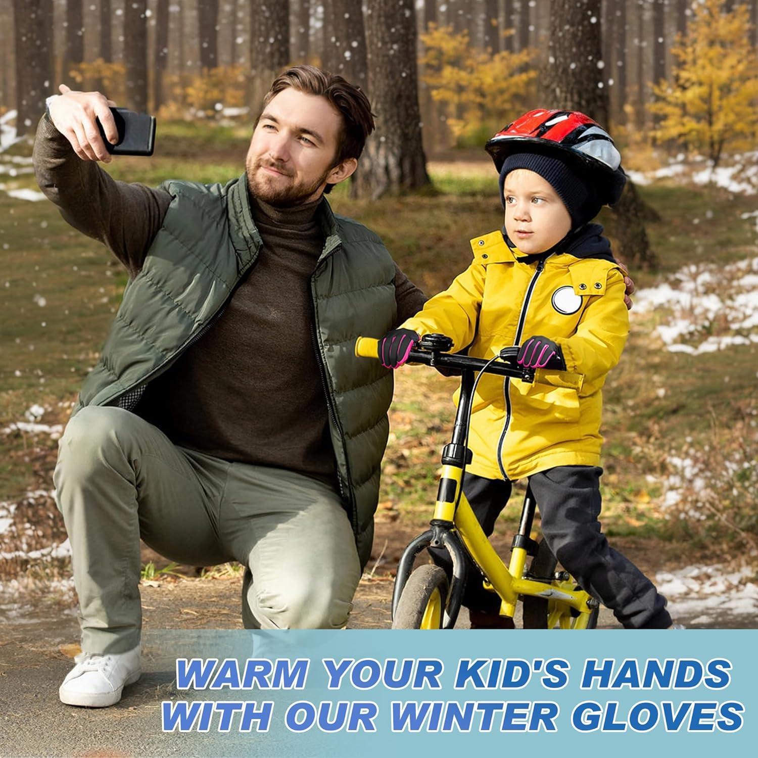 Safe and Anti-Slip for Firm Grip: Kids winter gloves are equipped with non-slip silicone on the palm and sides, which enhances grip and wear resistance, allowing children to easily hold toys, water cups or mobile phone, and adding extra safety when riding a bicycle in winter or playing outdoors