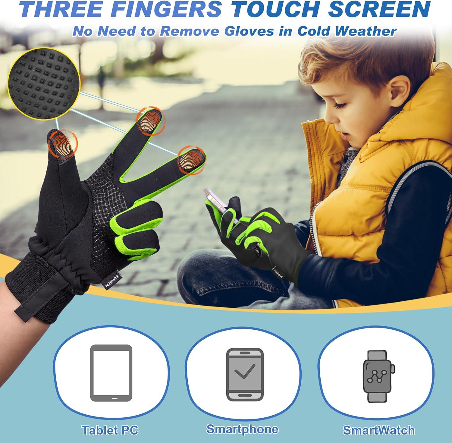 Three Fingers Touchscreen: The thumb and two index fingertips of these kids gloves winter are made from flexible PU material, compatible with all touchscreen devices. This means your child can play games, watch videos, or even take calls without having to take off their winter gloves