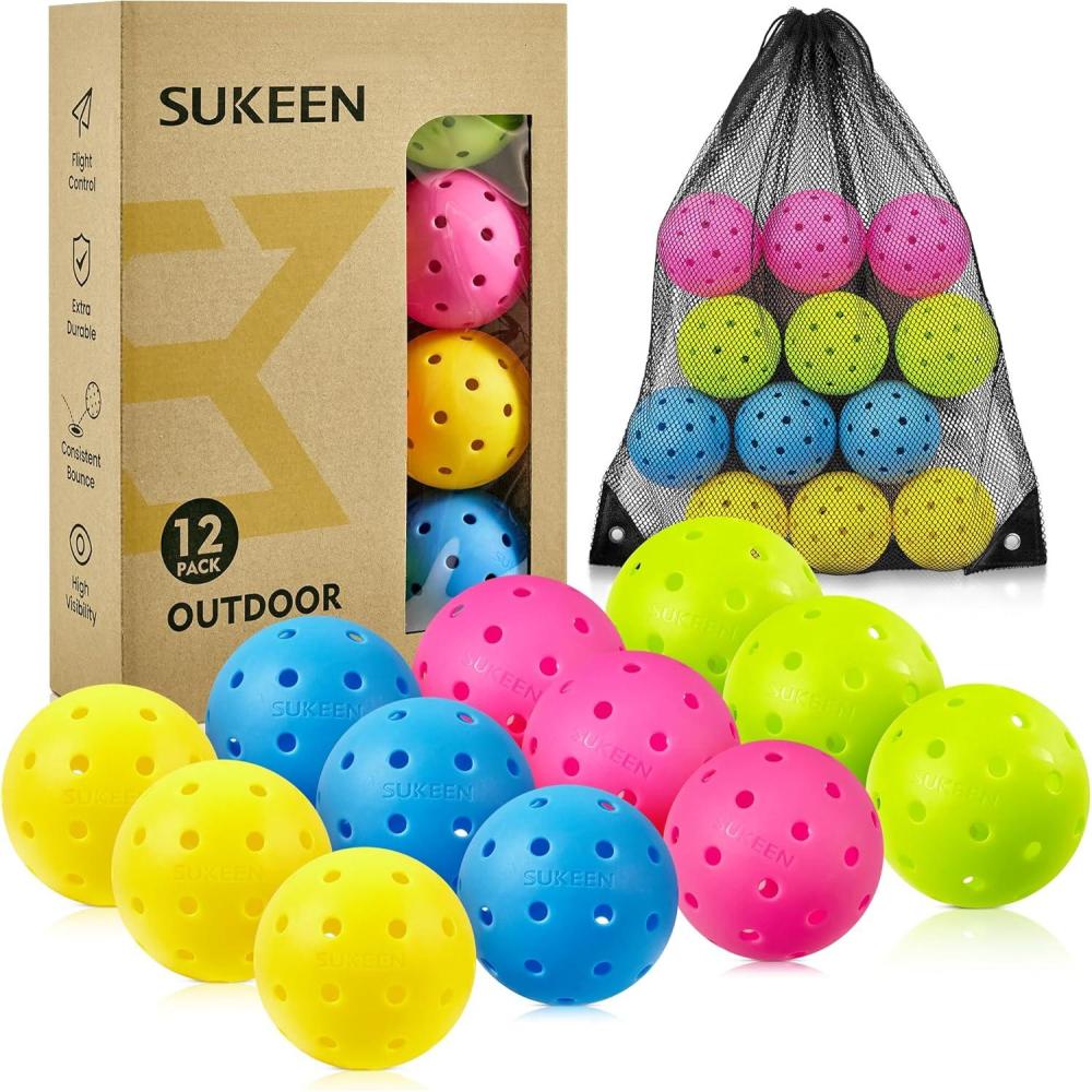 Save up to 40% on Sukeen Outdoor Pickleball Balls 40 Holes, High Bounce True Flight Pickleball Ball, High Visibility Outdoor Pickleballs, High Elasticity Pickle Balls with Mesh Bag(b Rose Red*3/Neon Green*3/Blue*3/Yellow*3) styles during our end-of-season sale.